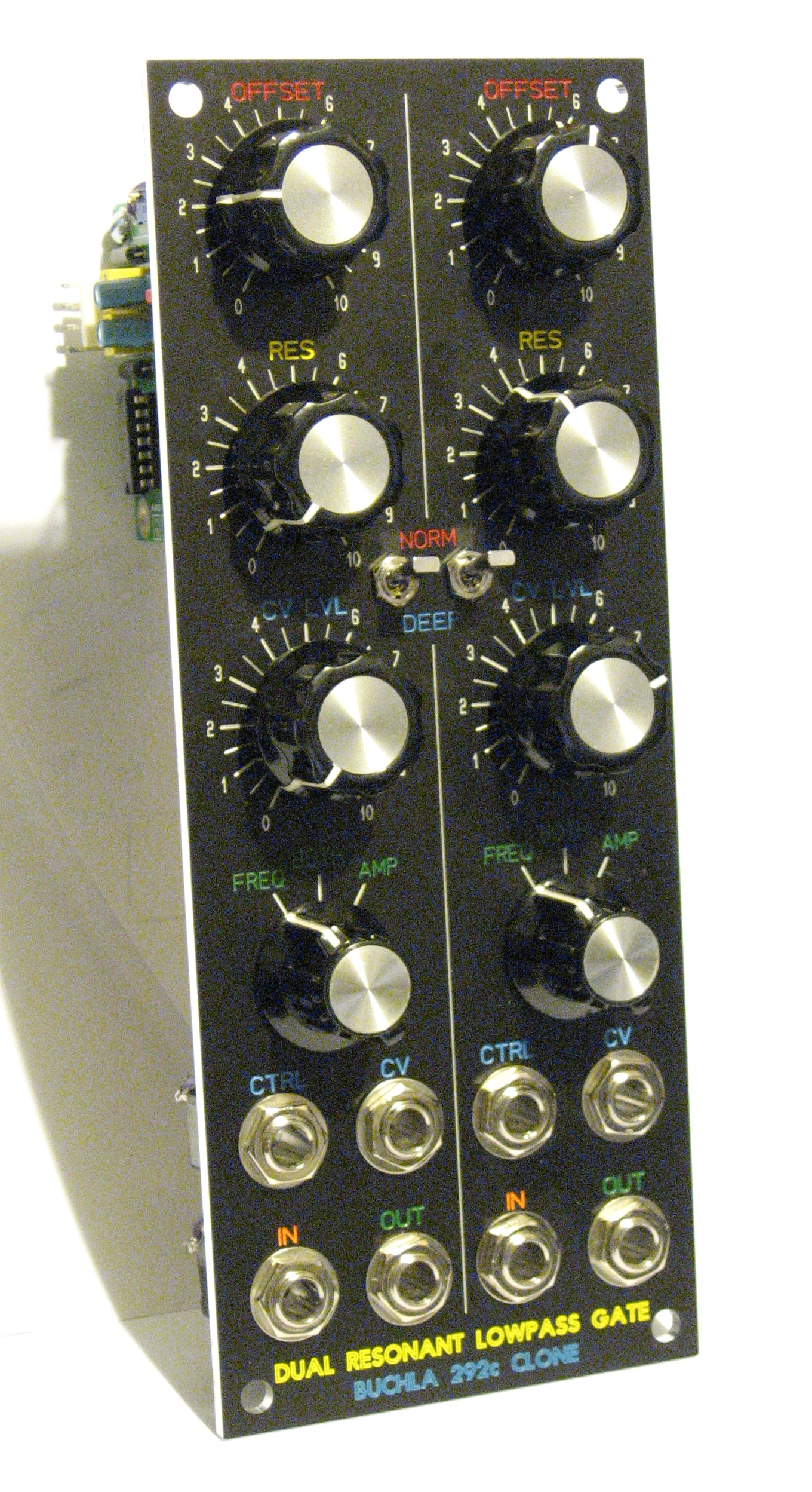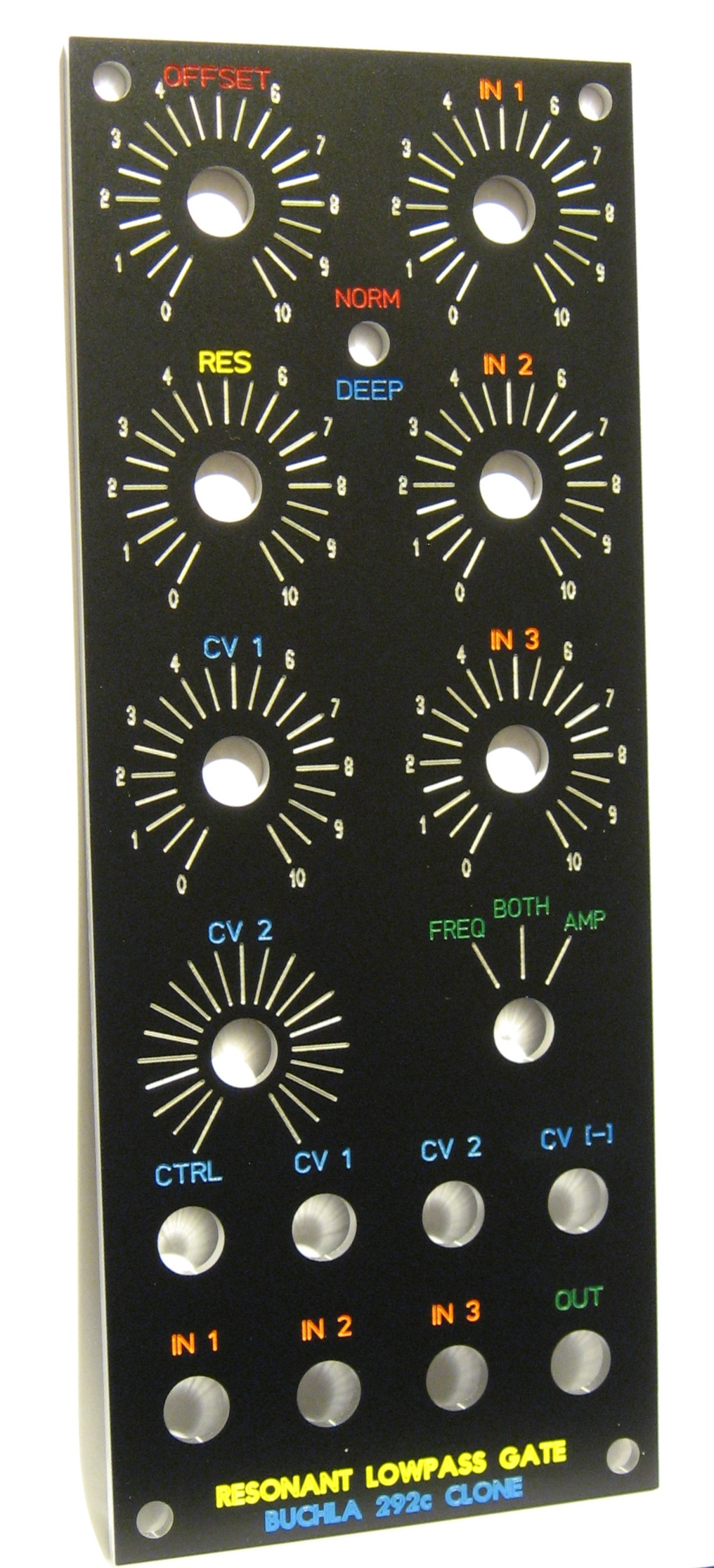 | panels by sduck | Buchla 292c clone panel |  | This is the panel as I received it. There';s no infill on the knob ticks and numberrs, which saves a bit of money and looks great. |
